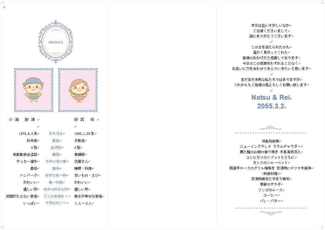 | 席次表 中紙 A4ワイドサイズ 裏 プロフィール・挨拶・メニュー表【観音開き】 |