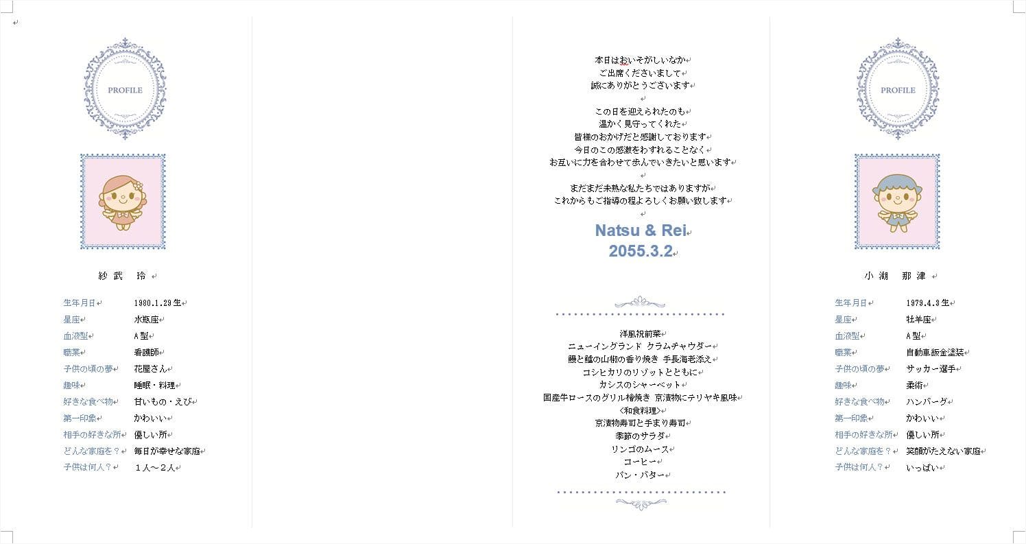 | 席次表 中紙 A4サイズ 裏 プロフィール・挨拶・メニュー表【三つ折り】 |